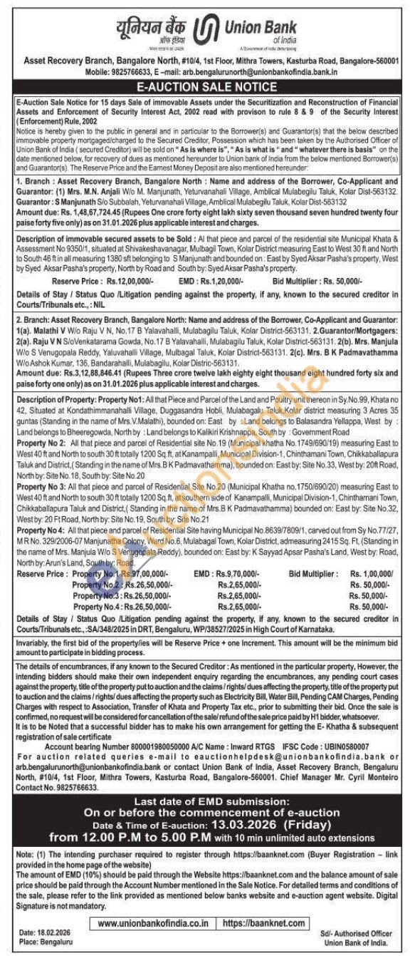 Property No 4: All that piece and parcel of Residential Site having Municipal No.8639/7809/1, carved out from Sy No.77/27, MR No. 329/2006-07 Manjunatha Colony, Ward No.6, Mulabagal Town, Kolar District, admeasuring 2415 Sq. Ft, (Standing in the name of Mrs. Manjula W/o S Venugopala Reddy), bounded on: East by: K Sayyad Apsar Pasha's Land, West by: Road, North by: Arun's Land, South by: Road.