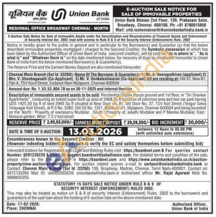 Residential Duplex House ground and 1st floor, in "Sri Shankar Apartments", measuring an extent super built up area of 2468 Sq ft inclusive of common area and two car park having UDS 1425.30 Sq ft of land 2943 Sq ft situated at New Door no. 81, old Door No. 37, TSV Koil Street (Tengur Selva Vinayagar Koil Street), at R S No. 3080, Old OS No. 1321, Block no. 61, Mylapore, Chennai-600004 and being bounded on the: North: Property of veerasamy Mudaliar, South: Property of, kalathi Mudaliar and P Manika Mudaliar, East: Mosque garden, West: TSV koil street