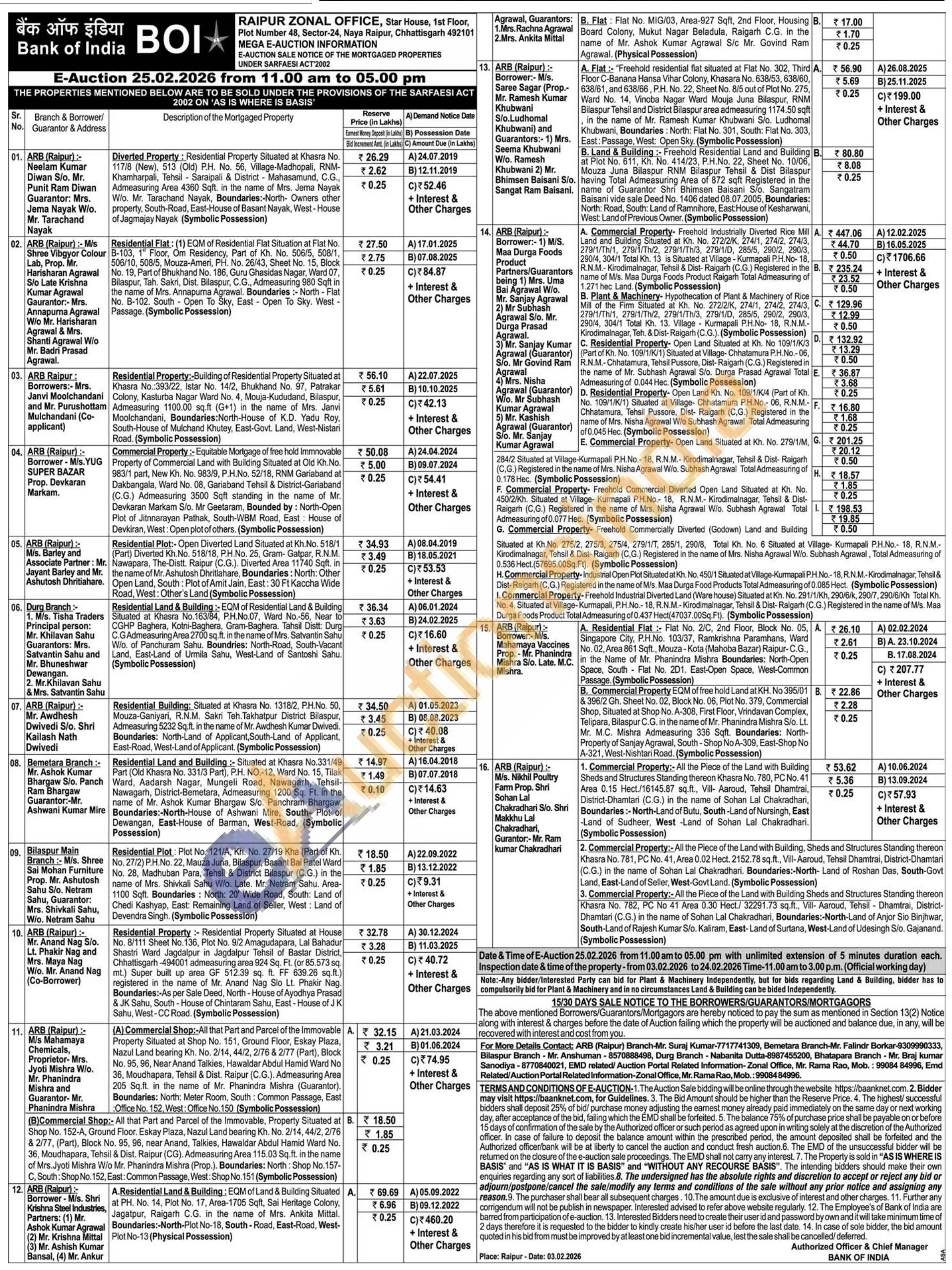 B. Commercial Property EQM of free hold Land at KH. No 395/01 B. & 396/2 Gh. Sheet No. 02, Block No. 06, Plot No. 379, Commercial Shop, Situated at Shop No. A-308, First Floor, Vrindavan Complex, Telipara, Bilaspur C.G. in the name of Mr. Phanindra Mishra S/o. Lt. Mr. M.C. Mishra Admeasuring 336 Sqft. Boundaries: North-Property of Sanjay Agrawal, South - Shop No A-309, East-Shop No A-321, West-Nishtari Road. (Symbolic Possession)