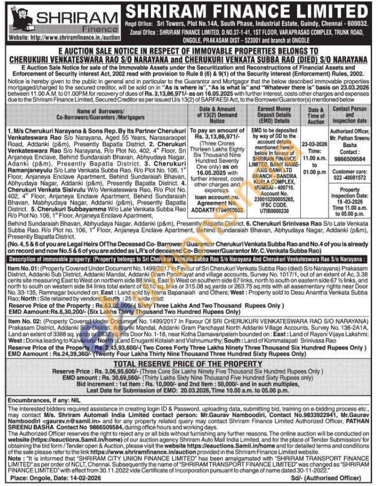 Item No. 02: (Property Covered Under Document No. 1499/2017 In Favour Of SRI CHERUKURI VENKATESWARA RAO S/O NARAYANA) Prakasam District, Addanki Sub District, Addanki Mandal, Addanki Gram Panchayat North Addanki Village Accounts, Survey No. 136-2A1A, Land an extent of 3388 sq. yards or 2832 sq.mts Door No. 1-18, near Kotha Damavaripalem bounded on: East: Land of Rayani Vijaya Lakshmi; West: Donka leading to Kaivakuru; North: Land Enuganti Kotaiah and Vishnumurthy, South: Land of Kommalapati Srinivasa Rao