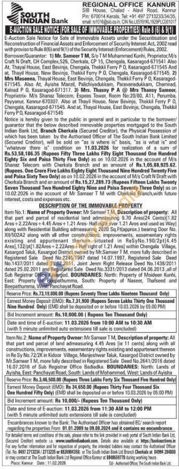 DESCRIPTION OF THE IMMOVABLE PROPERTY : Item No.2: Name of Property Owner: Mr Sameer TM, Description of property: All that part and parcel of land admeasuring 4.45 Ares [ie 11 cents along with all constructions, improvements, easementary rights existing and appurtenant thereon in Re Sy No.72/2K in Kidoor Village, Manjeshwar Taluk, Kasargod District owned by Mr.Sameer TM, more fully described in Registered Sale Deed No. 2641/2016 dated 16.07.2016 of Sub Registrar Office Badiadka. BOUNDARIES: North: Lands of Avisha, East: Panchayat Road, South: Lands of Mohammed, West: Lands of Ayisha