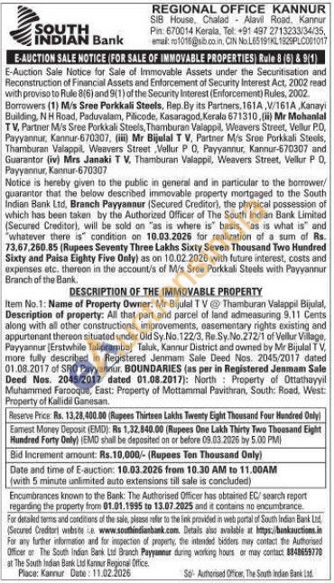 DESCRIPTION OF THE IMMOVABLE PROPERTY : Item No.1: Name of Property Owner: Mr Bijulal TV Thamburan Valappil Bijulial, Description of property: All that part and parcel of land admeasuring 9.11 Cents along with all other constructions, improvements, easementary rights existing and appurtenant thereon situated under Old Sy. No. 122/3, Re. Sy. No.272/1 of Vellur Village, Payyannur [Erstwhile Talipramba) Taluk, Kannur District and owned by Mr Bijulal TV, more fully described in Registered Jenmam Sale Deed Nos. 2045/2017 dated 01.08.2017 of SRO Payyannur, BOUNDARIES (as per in Registered Jenmam Sale Deed Nos. 2045/2017 dated 01.08.2017): North Property of Ottathayyil Muhammed Farooque, East: Property of Mottammal Pavithran, South: Road, West: Property of Kallidil Ganesan