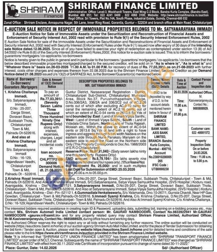 Guntur District, Narasaraopet Registration District, Chilakaluripet Sub-District, Chilakaluripet Municipal Area, Block No.37, Purushothapatnam Village, D.No.336/2A3, 336/2A and 336/2C2 out of AC.2.26 cents out of which after excluding AC.0-10 cents for canal the remaining extent of AC.2.16 cents, out of which an extent of AC.0-54 cents or 2613.6 Sq. Yds of land bounded by: East: Land of Immadi Vijaya Santhi,; West: Land of Immadi Vijaya Santhi,; South: Land of Vidadala China Satym, North: Land of Thota Rajaiah, Molaiah etc,. Within the above an extent of AC.0-54 cents or 2613.6 Sq. Yds of land with a right to have ingress and aggress through 5 Yds width Nadava on the eastern side through Nune Panakalu Manyam on the eastern side to reach the Road on the Northern side Only (This Property Corresponds to Doc. No. 1966/2003 of S.R.O Chilakaluripet)