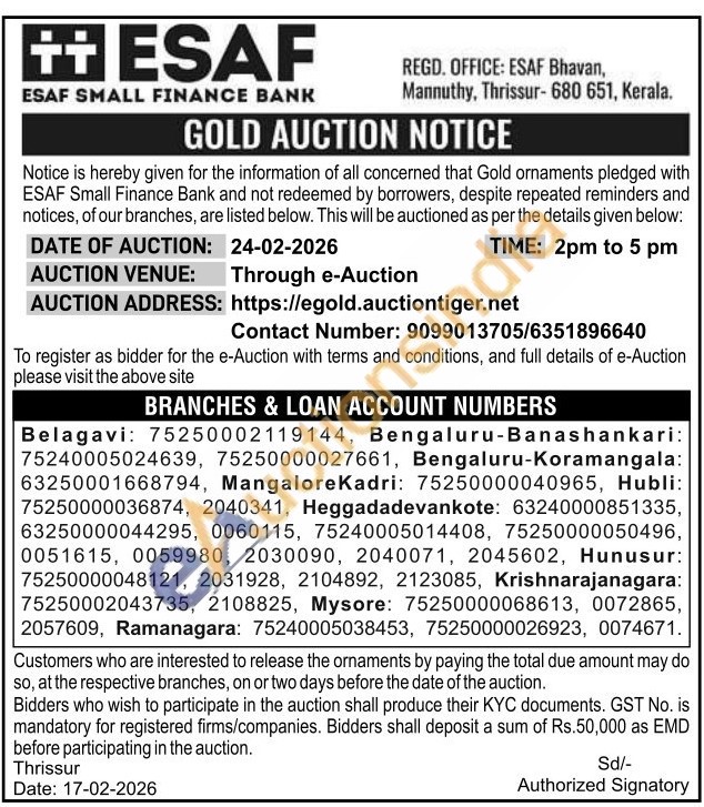 ESAF SMALL FINANCE BANK Gold Auctions Auction in Thrissur