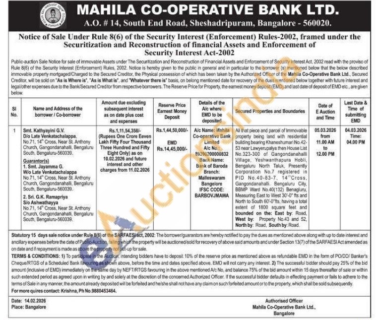 All that piece and parcel of Immovable property being land with residential building bearing Khaneshumari No 42-53 near Lawyerupalya then House List No.323-300 of Gangondanahalli Village, Yeshwanthapura Hobli, Bengaluru North Taluk, Presently Corporation No.7 registered in PID No.40-83-7, 14 Cross, Gangondanahalli Bengaluru City, BBMP Ward No. 40(132) Benagluru, Measuring East to West 30-0" fts and North to South 60-0'fts, having a total extent of 1800 square feet and bounded on the East by Road, West by: Property No.43 and 52, North by: Road, South by: Road