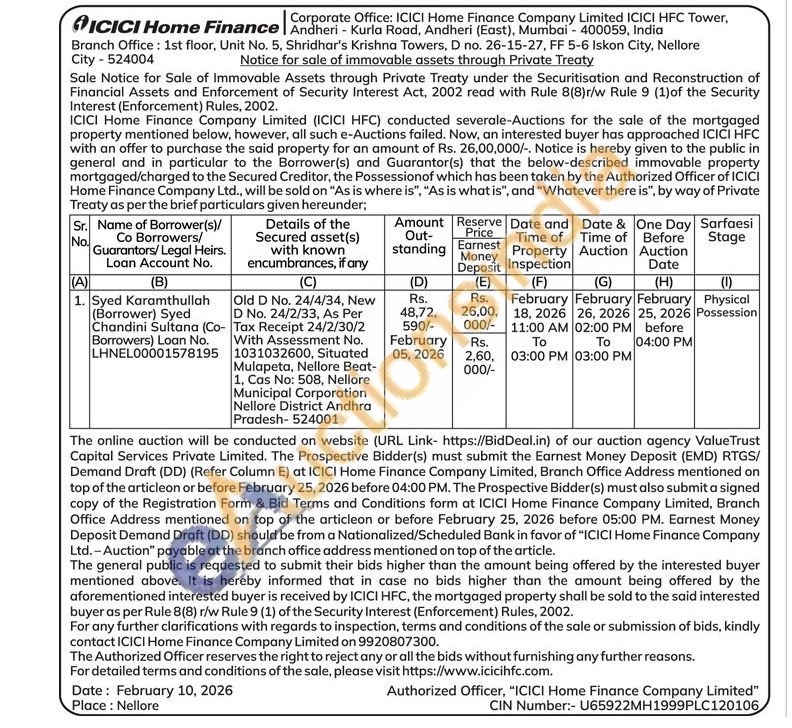 Old D No. 24/4/34, New D No. 24/2/33, As Per Tax Receipt 24/2/30/2 With Assessment No. 1031032600, Situated Mulapeta, Nellore Beat-1, Cas No: 508, Nellore Municipal Corporation Nellore District Andhra Pradesh-524001