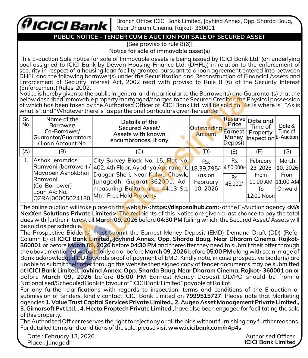 City Survey Block No. 15, Flat No. 402, 4th Floor, Ayodhya Apartment, Dabgar Sheri, Near Kalwa Chowk, Junagadh, Gujarat-362001. Ad-measuring Builtup area 44.13 Sq. Mtr.- Free Hold Property
