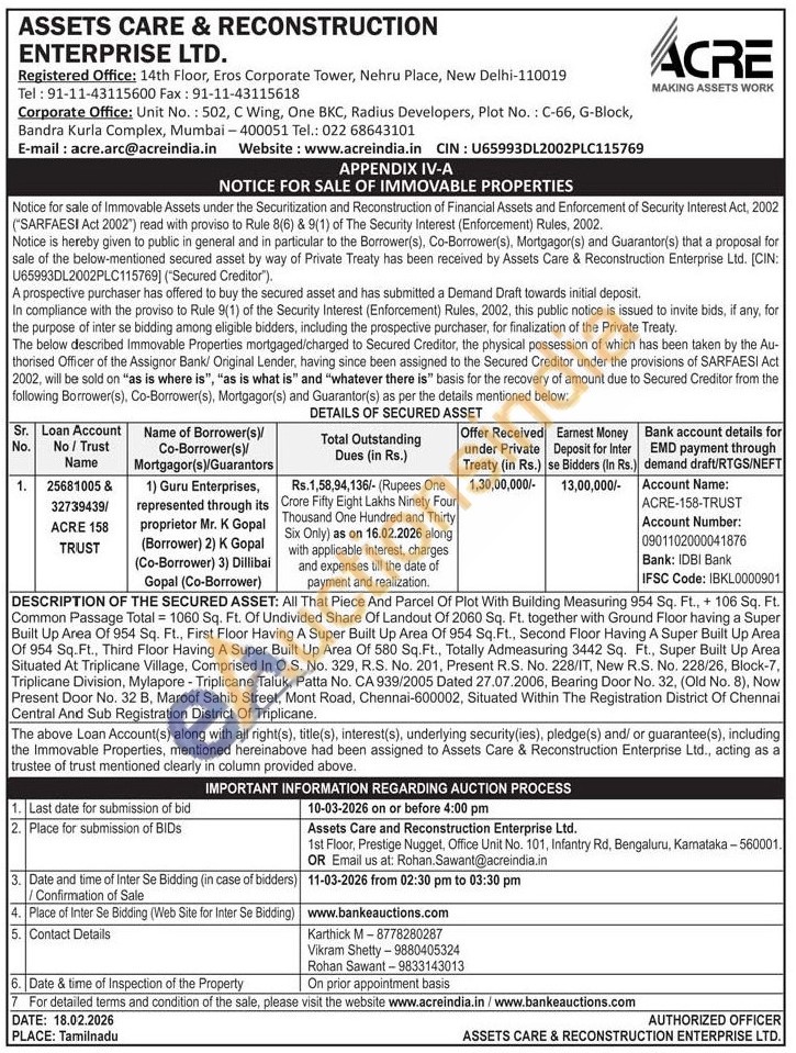 DESCRIPTION OF THE SECURED ASSET: All That Piece And Parcel Of Plot With Building Measuring 954 Sq. Ft., + 106 Sq. Ft. Common Passage Total = 1060 Sq. Ft. Of Undivided Share Of Landout Of 2060 Sq. Ft. together with Ground Floor having a Super Built Up Area Of 954 Sq. Ft., First Floor Having A Super Built Up Area Of 954 Sq.Ft., Second Floor Having A Super Built Up Area Of 954 Sq.Ft., Third Floor Having A Super Built Up Area Of 580 Sq.Ft., Totally Admeasuring 3442 Sq. Ft., Super Built Up Area Situated At Triplicane Village, Comprised In O.S. No. 329, R.S. No. 201, Present R.S. No. 228/IT, New R.S. No. 228/26, Block-7. Triplicane Division, Mylapore - Triplicane Taluk, Patta No. CA 939/2005 Dated 27.07.2006, Bearing Door No. 32, (Old No. 8), Now Present Door No. 32 B, Maroof Sahib Street, Mont Road, Chennai-600002, Situated Within The Registration District Of Chennai Central And Sub Registration District Of Triplicane
