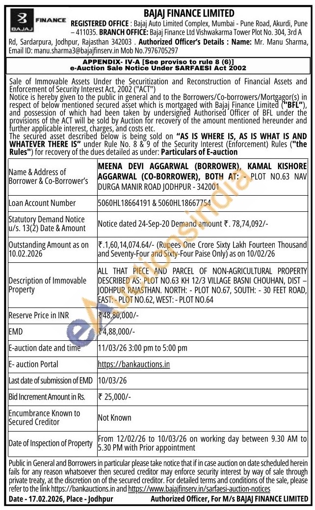 ALL THAT PIECE AND PARCEL OF NON-AGRICULTURAL PROPERTY DESCRIBED AS: PLOT NO.63 KH 12/3 VILLAGE BASNI CHOUHAN, DIST -JODHPUR RAJASTHAN. NORTH: PLOT NO.67, SOUTH: 30 FEET ROAD, EAST:-PLOT NO.62, WEST: - PLOT NO.64