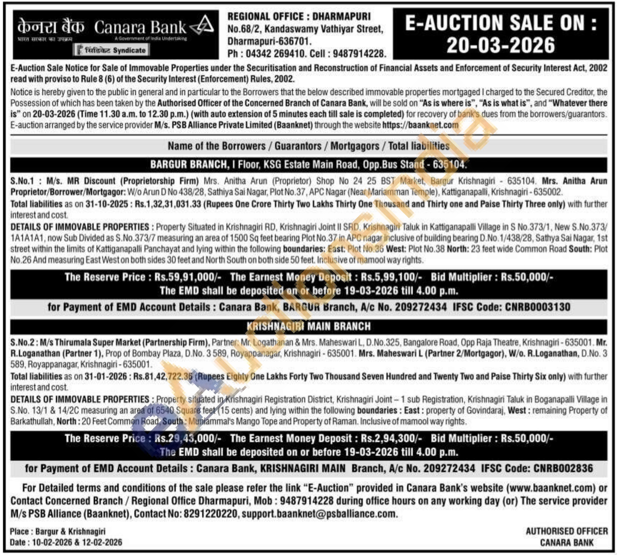 Contact Concerned Branch/Regional Office Dharmapuri, Mobile No : 9487914228