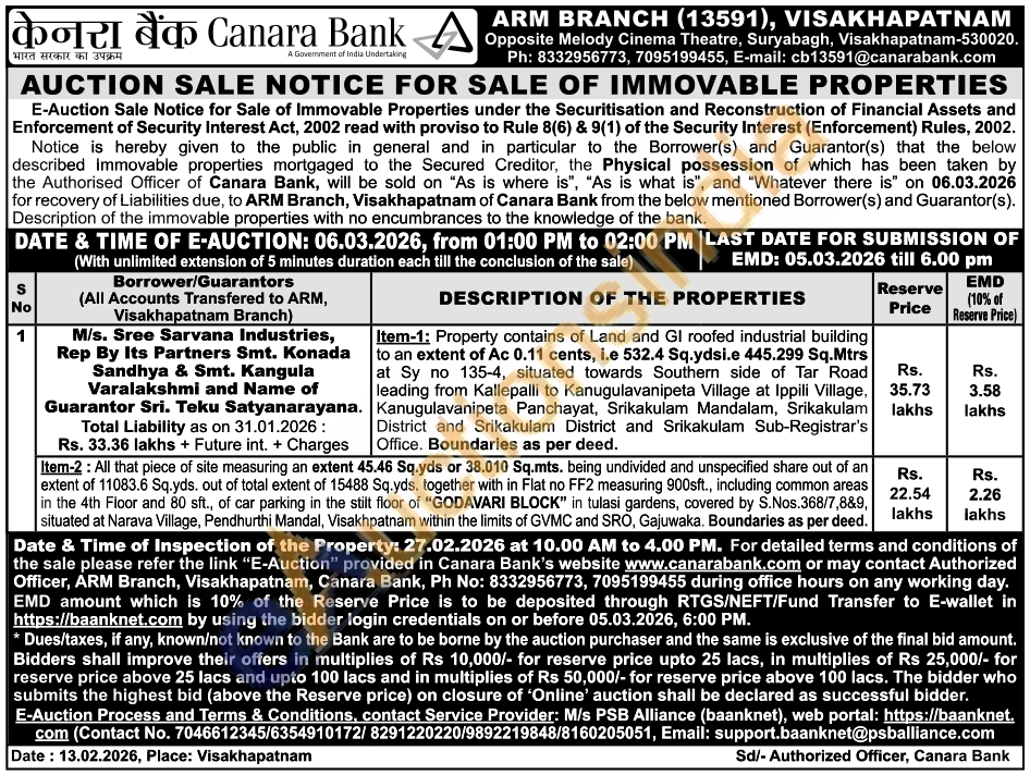 Item-1: Property contains of Land and Gl roofed industrial building to an extent of Ac 0.11 cents, i.e 532.4 Sq.ydsi.e 445.299 Sq.Mtrs at Sy no 135-4, situated towards Southern side of Tar Road leading from Kallepalli to Kanugulavanipeta Village at Ippili Village, Kanugulavanipeta Panchayat, Srikakulam Mandalam, Srikakulam District and Srikakulam District and Srikakulam Sub-Registrar's Office. Boundaries as per deed