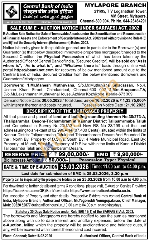All that piece and parcel of land and building standing thereon No.38/273-A, Thaliparamba, Desom-Trichambram in Kannur District Talipamrmaba Taluk and Comprised in Survey No.23/1A3 and New RS No 23/199 and the land admeasuring to an extant of 02.996 Ares (07.400 Cents), situated within the limits of Kannur District Talipamrmaba Taluk and Trichambaram Desam And Bounded On the: North By: Property of D.Silva, South By: 4 Metre Municipal Road, East By: Property of Murali, West By: Property of D.Silva within the limits of Kannur District Taliparamba Taluk and Trichambaram Desam
