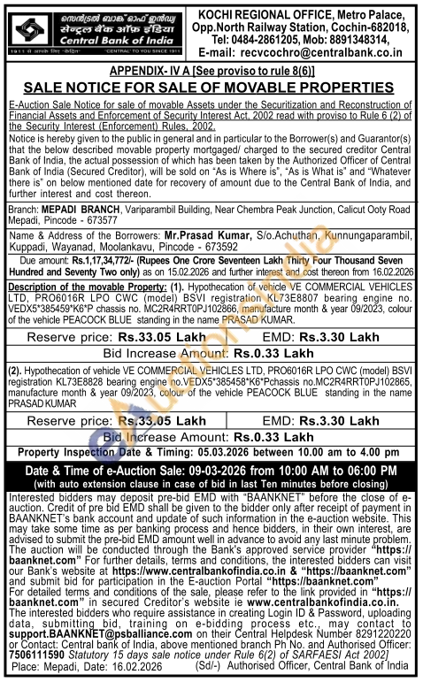 Description of the movable Property: (1). Hypothecation of vehicle VE COMMERCIAL VEHICLES LTD, PRO6016R LPO CWC (model) BSVI registration KL73E8807 bearing engine no. VEDX5*385459*K6*P chassis no. MC2R4RRT0PJ102866, manufacture month & year 09/2023, colour of the vehicle PEACOCK BLUE standing in the name PRASAD KUMAR