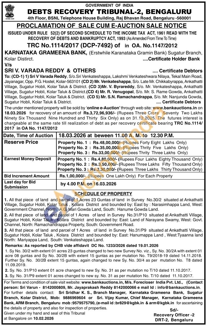 1. All that piece of land and parcel of 1 Acres 23 Guntas of land in Survey No.30/2 situated at Ankathatti Village, Sugatur Hobli, Kolar Taluk, Kolara District and bounded by: East by: Narasimhappa Land, West: Government Channel, North: A.G. Mari Gowda Land, South: Hanume Gowda Land