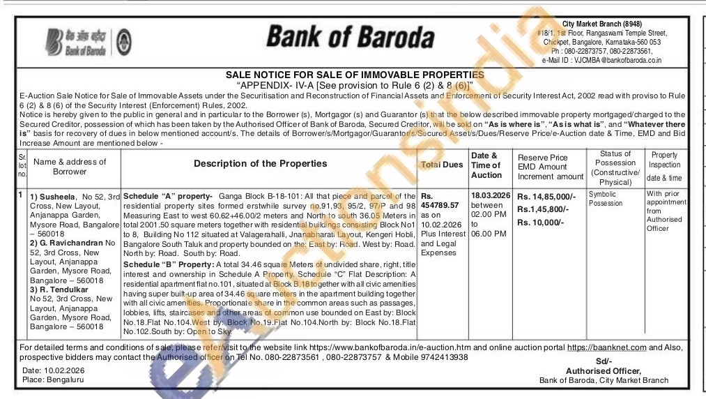 Schedule "A" property- Ganga Block B-18-101: All that piece and parcel of the residential property sites formed erstwhile survey no.91,93, 95/2, 97/P and 98 Measuring East to west 60.62+46.00/2 meters and North to south 36.05 Meters in as on total 2001,50 square meters together with residential buildings consisting Block No1 to 8, Building No 112 situated at Valagerahalli, Jnanabharati Layout, Kengeri Hobli, Bangalore South Taluk and property bounded on the: East by: Road. West by: Road. North by: Road. South by: Road.