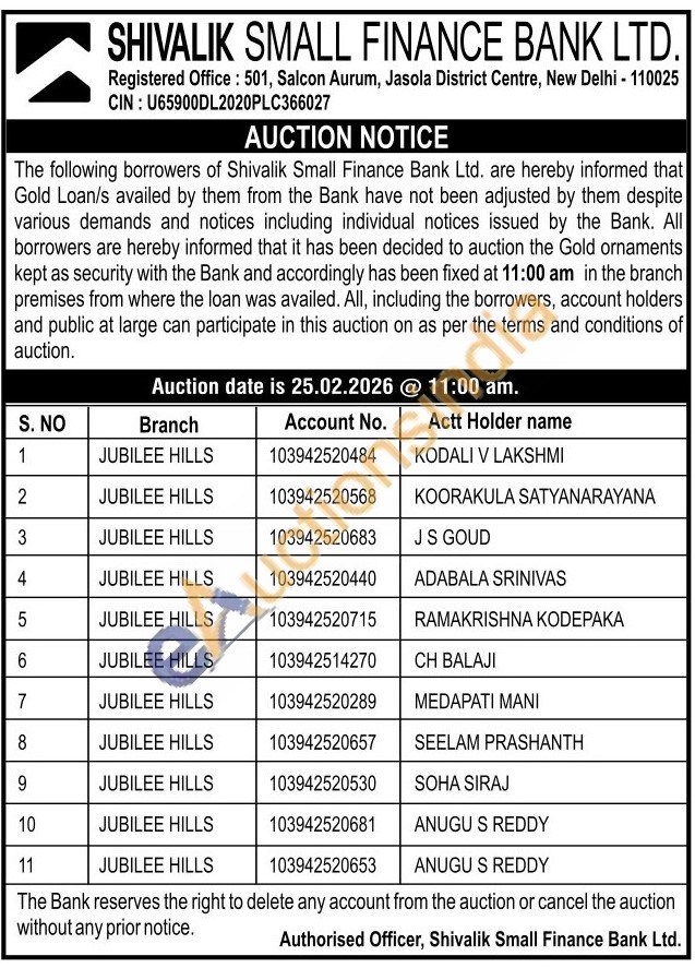 Shivalik Small Finance Bank Ltd Gold Auctions Auction in Hyderabad