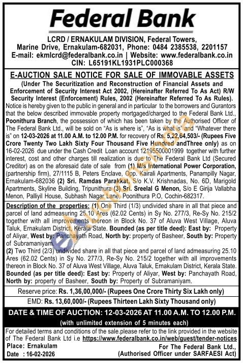 Description of the properties: (1) One Third (1/3) undivided share in all that piece and parcel of land admeasuring 25.10 Ares (62.02 Cents) in Sy No. 277/3, Re-Sy No. 215/2 together with all improvements thereon in Block No. 37 of Aluva West Village, Aluva Taluk, Ernakulam District, Kerala State, Bounded (as per title deed): East by: Property of Aliyar, West by: Panchayath Road, North by: property of Basheer, South by: Property of Subramaniyam.