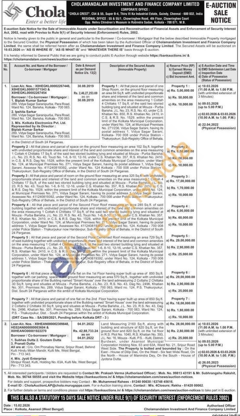 Property 2: All that piece and parcel of space on the ground floor measuring an area 102 Sq.ft. together with undivided proportionate share and interest of the land and common amenities on the area measuring 1 Cottah 4 Chittaks 17 Sq.ft. of the said two storied building lying and situated at Mouza - Purba Barisha, J.L. No. 23, R.S. No. 43, Touzi No. 1-6, 8-10, 12-16, under C.S. Khatian No. 357, R.S. Khatian No. 2410, in C.S. & R.S. Dag No. 1528, within the present limit of the Kolkata Municipal Corporation, under Ward No. 124, at Municipal Premises No. 271, Vidya Sagar Sarani, having its postal address 1, Vidya Sagar Sarani, Assesse No. 411240819392, under Ward No. 124 Kolkata 700 008 under Police Station -Thakurpukurr, Sub-Registry Office of Behala, in the District of South 24 Parganas