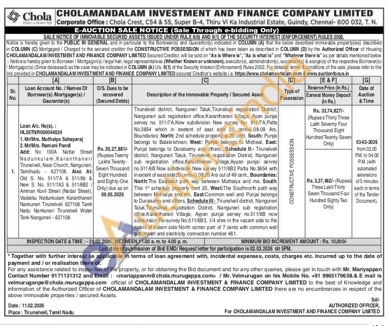 Tirunelveli district, Nanguneri Taluk, Tirunelveli registration District, Nanguneri sub registration office, Karanthaneri Village, Ayan punjai servey no. 511/7A, Now subdivision New survey No. 511/7A, Patta No.3854 which in exetent of east side 20 cent=0.08.09 Ars. Boundaries: North: 2nd schedule property is 20 cent, South: Punjai belongs to Balakrishnan, West: Punjai belongs to Micheal, East: Punjai belongs to Duraisamy and others., Schedule II:- Tirunelveli district, Nanguneri Taluk, Tirunelveli registration District, Nanguneri sub registration office, Karanthaneri Village, Ayyan punjai servey no.511/6B Now subdivision New survey 511/6B2 Patta No.3854 with in extent of east side 20 cent=0.08.09 Ars out of 49 cent., Boundaries: North: The Eastwest path way between Muthaiya and me, South: This 1 schedule property cent 20, West: The Southnorth path way between Muthaiya and me, East:Common well and Punjai belongs to Duraisamy and others, Schedule III:- Tirunelveli district, Nanguneri Taluk, Tirunelveli registration District, Nanguneri sub registration office, Karanthaneri Village, Ayyan punjai servey no.511/6B now subdivision Re-survey No:511/6B3, 1/4 shre in the vacant side to the extent of estern side North corner part of 7 cents with common well with motor and electricity connection number 461.