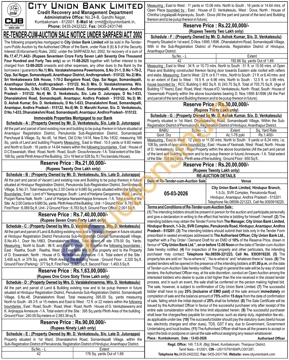 Schedule-G: (Property Owned by Mr. D. Ashok Kumar, S/o. D. Venkatesulu) Property situated in 1st Ward, Dhanalakshmi Road, Somandepalli Village, Within the Sub-Registration District of Pennukonda, Registration District of Hindupur, Ananthapur District. Measuring: East to West: 12 yards or 11.00 mtrs. North to South: 9 yards or 8.24 mtrs. i.e, 108 Sq. yards of open place bounded by: East: House of Yasinsab, West: Road, North: House of D. Venkatesulu, South: Road Property within the above boundaries (All the part and parcel of the land and building thereon and to be putup thereon in future) Annexure -1 A. Total extent of the Site: 108 Sq.yards, Plinth area of the building: Ground Floor: 650 Sq ft..