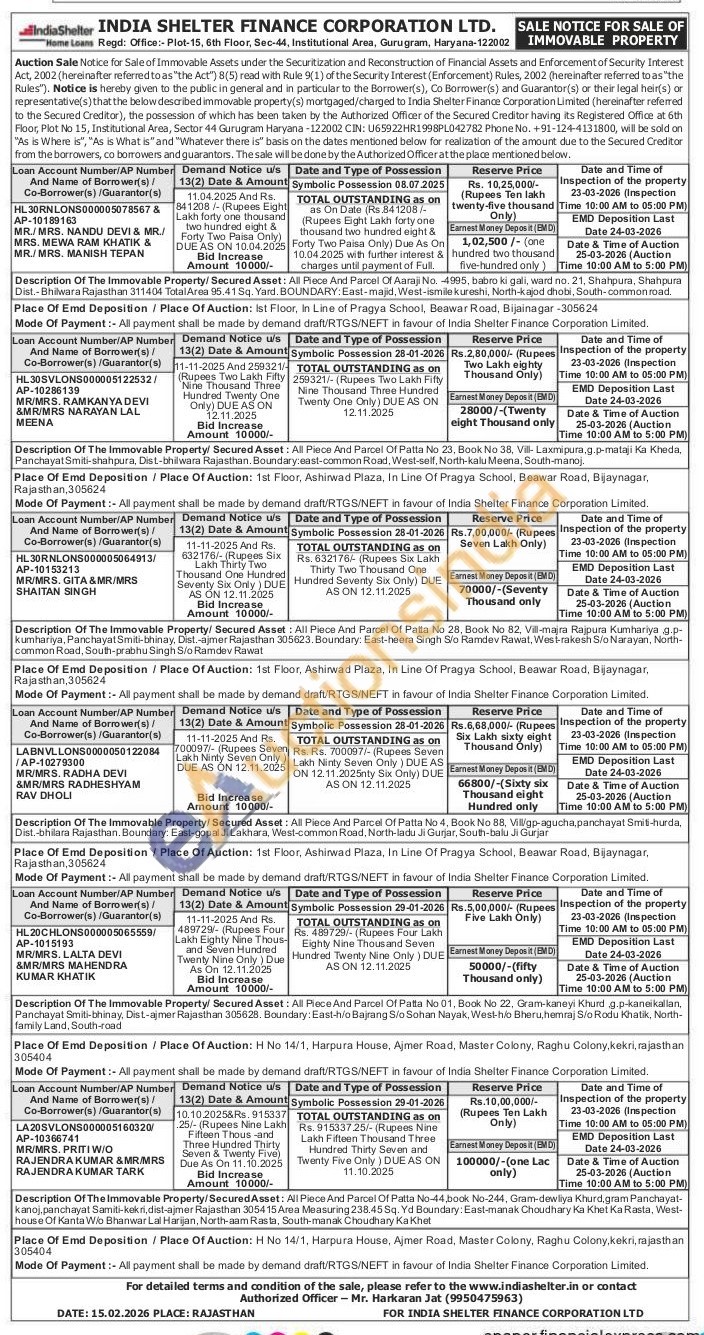 Description Of The Immovable Property/Secured Asset: All Piece And Parcel Of Patta No-44,book No-244, Gram-dewliya Khurd,gram Panchayat-kanoj.panchayat Samiti-kekri, dist-ajmer Rajasthan 305415 Area Measuring 238.45 Sq. Yd Boundary: East-manak Choudhary Ka Khet Ka Rasta, West-house Of Kanta Wio Bhanwar Lal Harijan, North-aam Rasta, South-manak Choudhary Ka Khet