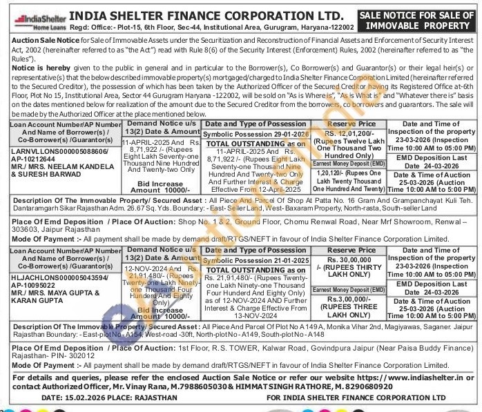 Description Of The Immovable Property/Secured Asset: All Piece And Parcel Of Plot No A 149A, Monika Vihar 2nd, Magiyawas, Saganer, Jaipur Rajasthan Boundary:-East-plot No-A154, West-road -30ft, North-plot No-A149, South-plot No-A148