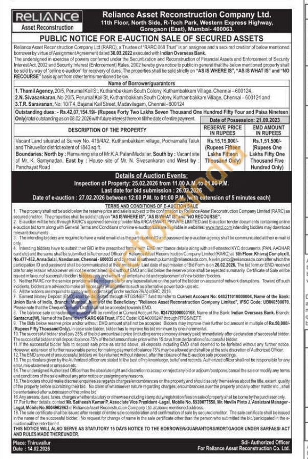Vacant Land situated at Survey No. 419/4A2. Kuthambakkam village, Poonamalle Taluk and Thiruveilor district extent of 1843 sq.ft. Boundaries: North by: Remaining site of Mr.K.A.Palani Mudaliar, South by: Vacant site of Mr. K. Samynadan, East by: House site of Mr. N. Sivasankaran and West by Panchayat Road