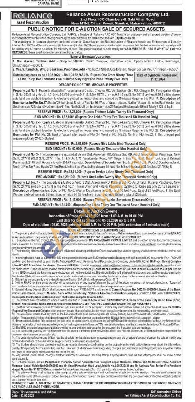 Property Lot No.1-Property situated in Tiruvannamalai District, Cheyyar RD, Vembakkam Sub RD, Cheyyar TK, Perungattur village in S. No. 683/81 dry Mac 0.11.5.5. No 883/82 dry Hec 011.5.8 No. 687/1 dry Hec 0.11.5 and 8 No. 687/2 dry Hoc 0.36.5 all the above said land are clubbed together, leveled and plotted as house siles and named as Srinivasa Nagar in this Plot 17. Description of Boundaries for Plot No.17: East of 23 feet street. South of Plot No. 16, West of Mecantsile and North of Varant site in this East Weston the Southern side 72 feet and Northem side 61 feet. Nonh South on the Westem side 25 leetand Eastem side feet Totally 312558