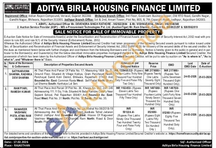 ABHFL: Authorized Officer Mr. DEVENDRA SINGH RATHORE-9829222694 & Mr. VISHNUDAYAL SINGH-9929546548