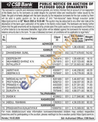 CSB Bank Gold Auctions Auction in Kannur