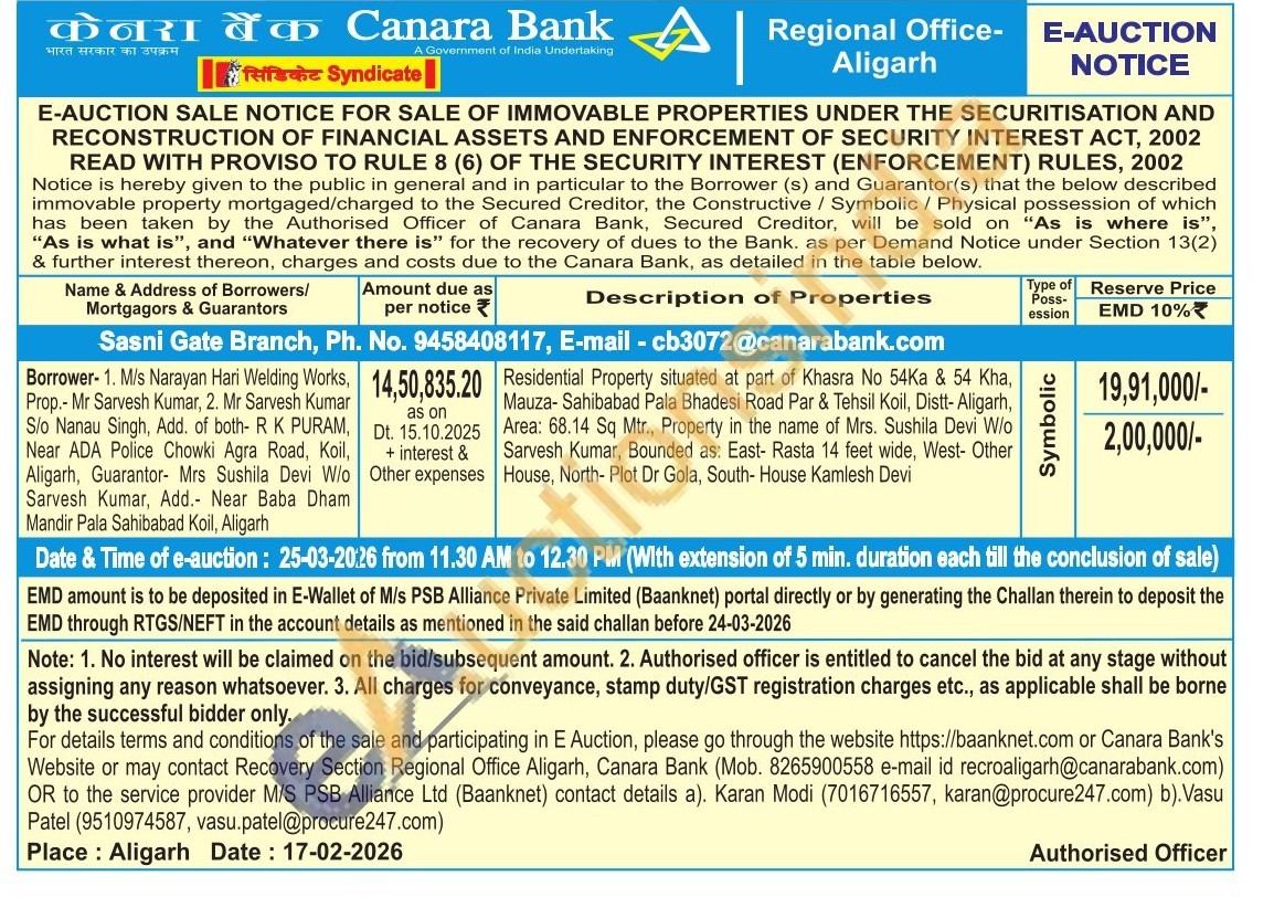Residential Property situated at part of Khasra No 54Ka & 54 Kha, Mauza- Sahibabad Pala Bhadesi Road Par & Tehsil Koil, Distt- Aligarh, Area: 68.14 Sq Mtr., Property in the name of Mrs. Sushila Devi W/o Sarvesh Kumar, Bounded as: East- Rasta 14 feet wide, West- Other House, North- Plot Dr Gola, South- House Kamlesh Devi