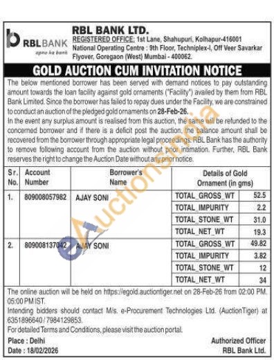 RBL Bank Gold Auctions Auction in New Delhi