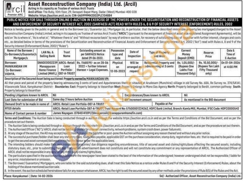 All that piece and parcel of the property bearing admeasuring 3 cents of land and Apputenances there on sitauted at Arudesam (Munchirai) viillage in old Survey No. 68A, Re Survey no. 374/5A1A1, Vilavancode Taluk, Kanyakumari District Boundaries: East: Property belongs to Vasanthan West: Property Belongs to Mano Gas Agency North: Property belonged to Berdit, common pathway South: Property belongs to Vasanthan