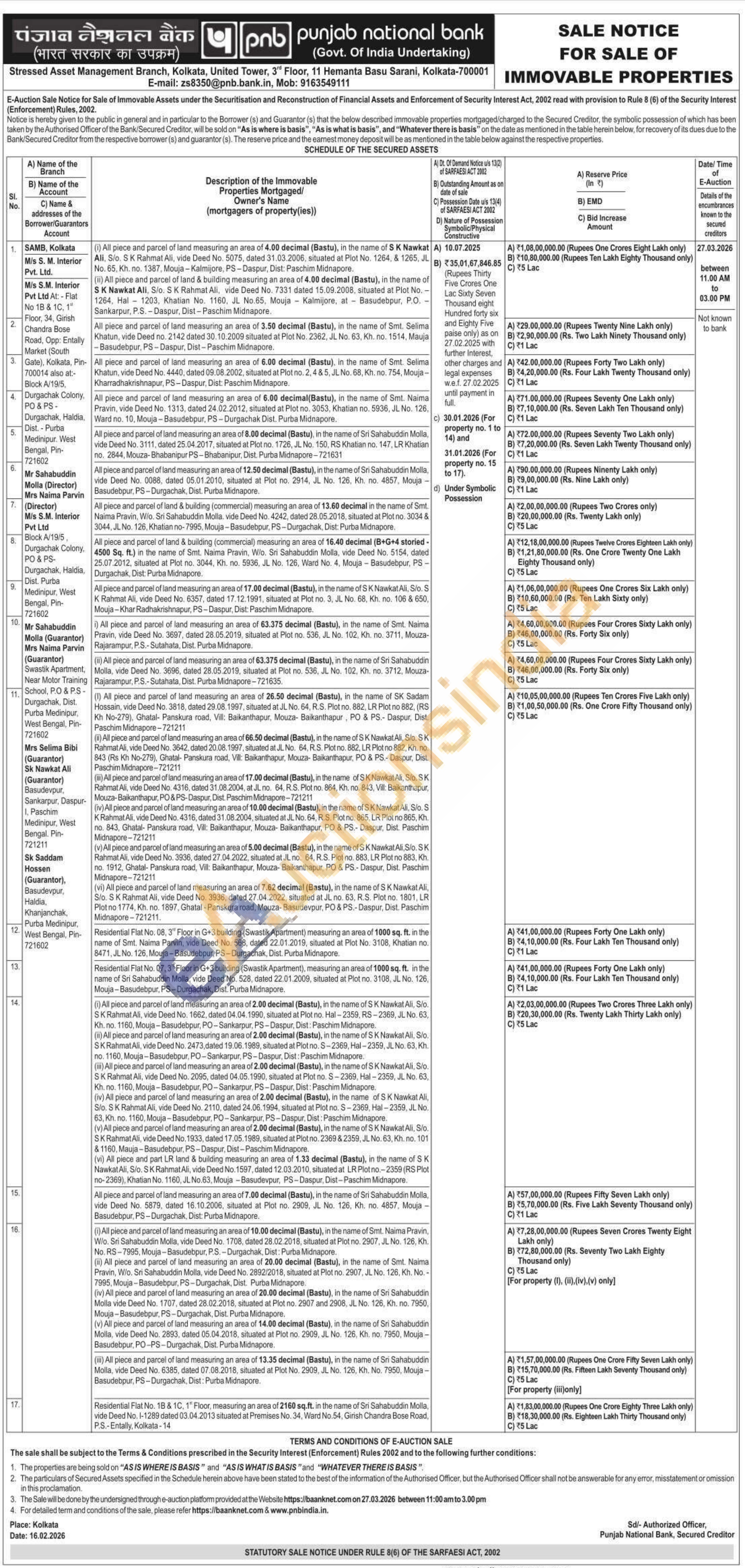 All piece and parcel of land measuring an area of 7.00 decimal (Bastu), in the name of Sri Sahabuddin Molla, vide Deed No. 5879, dated 16.10.2006, situated at Plot no. 2909, JL No. 126, Kh. no. 4857, Mouja-Basudebpur, PS-Durgachak, Dist: Purba Midnapore.
