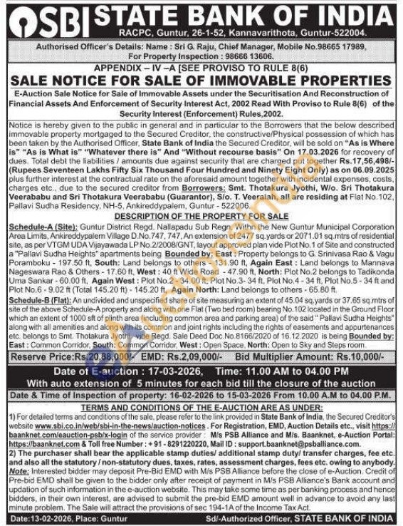 Schedule-A (Site): All the piece or parcel of land situated in Guntur District, Koritepadu SRO, within Guntur Municipal Corporation area Limits, Koritepadu Village Survey D. No. 143, Near Door No. 11-235, an extent of 808 Sq.yards or 675.59 sq.mtrs of residential site in which constructed of Varshitha Homes apartment, along with its easements and appurtenances etc. is being Bounded by: East: Property belongs to Chaganti Pulla Reddy-83.80 ft. South: Property belongs to Karasani China Kotireddy etc-90.00 ft, West: Property belongs to Kanyaka Parameswari-80.80 ft, North: 30 ft wide Road-90.00 ft. Schedule-B (Flat): An undivided and unspecified share of site measuring an extent of 40.40 sq yards or 33.77 sq.mtrs of site out of total site 808 yards or 675.59 sq.Mtrs of site (ie. Schedule-A) along with one finished two Bed Room Flat bearing No. 103 with a plinth area of 1086 sq.ft located in First Floor of Varshitha Homes Apartments which common amenities, situated at Opp. ID Hospital, Nagaralu, Amaravathi Road, Gorantla Village, Gntur Registered at Koritepadu SRO, Guntur District Registration vide Regd. Sale Deed Doc. No.58-2016 of 05.01.2016 standing in the name of Smt. Deta Esteru Rani is being Bounded by: East: Open to Sky, South: Open to Sky. West: Common Corridor, North: Lift and Open to Sky.
