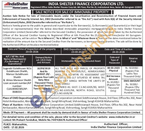 ALL THAT PIECE AND PARCEL OF PROPERTY BEARING C.S NO.6305/9/C, ADMEASURING AREA 25.8 SQ MTRS ITS ASSESSMENT LIST NO. 19721-216-117 SITUATED AT MIRAJ TAL MIRAJ DIST SANGLI WITHIN THE LIMITS OF SMKC SANGLI BOUNDED AS: EAST: C.S.NO.6305/9D, WEST: C.S.NO.6305/98, NORTH: ROAD, SOUTH: CS.NO.6305/9E