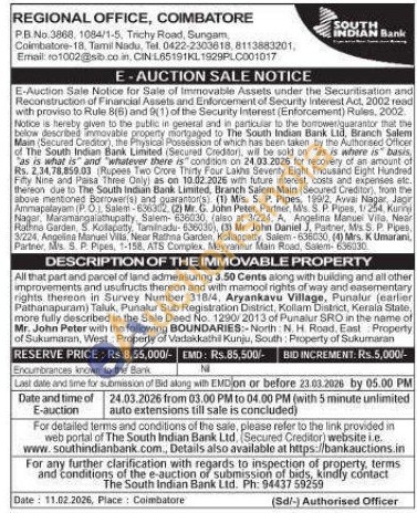All that part and parcel of land admeasuring 3.50 Cents along with building and all other improvements and usufructs thereon and with mamool rights of way and easementary rights thereon in Survey Number 318/4, Aryankavu Village, Punalur (earlier Pathanapuram) Taluk, Punalur Sub Registration District, Kollam Distinct, Kerala State, more fully described in the Sale Deed No. 1290/2013 of Punalur SRO in the name of Mr. John Peter with the following BOUNDARIES: North N. H. Roed. East Property of Sukumaran, West Property of Vadakkathil Kunju, South Property of Sukumaran