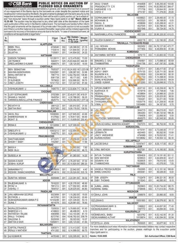 CSB Bank Gold Auctions Auction in Alappuzha