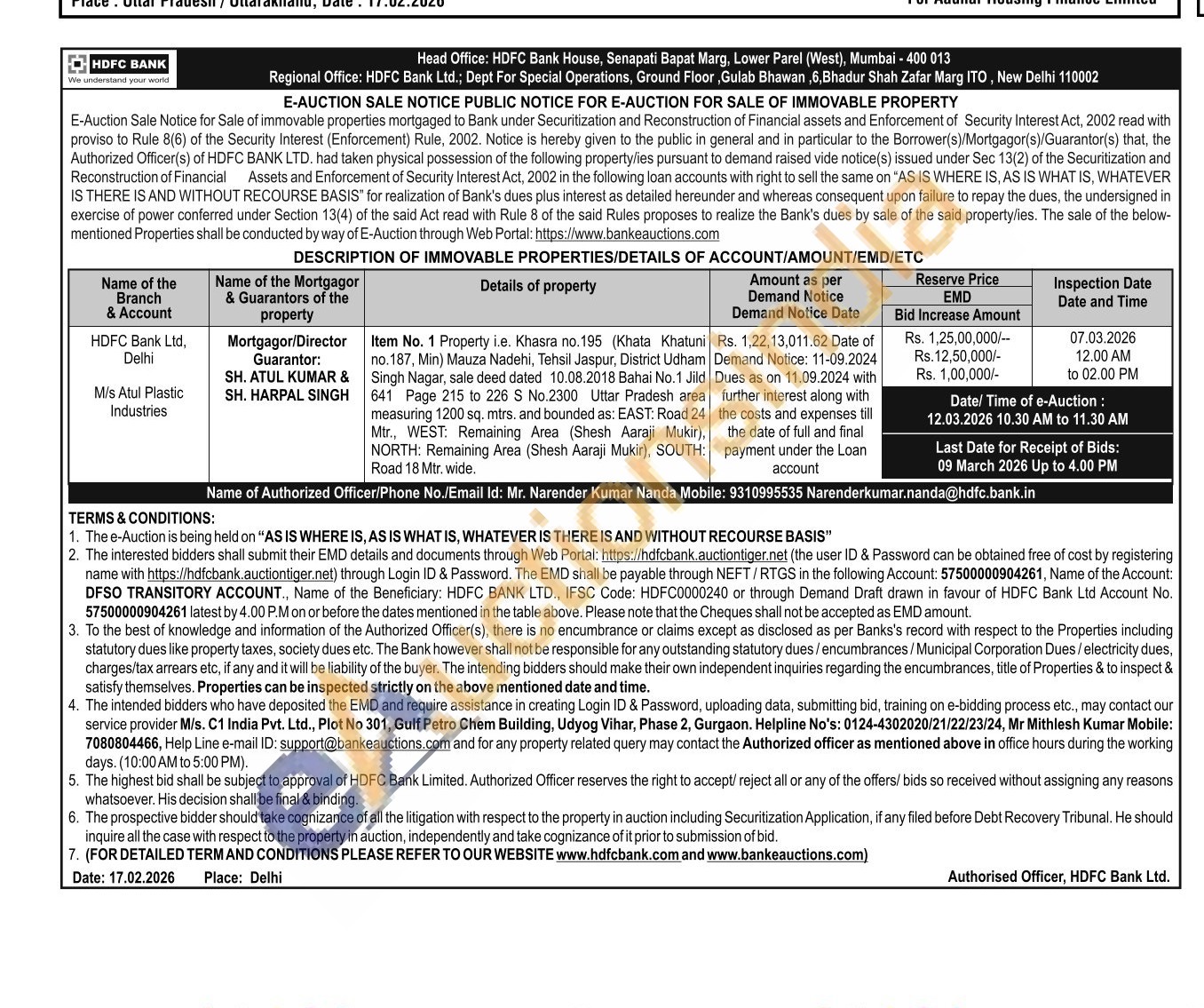 Item No. 1 Property i.e. Khasra no. 195 (Khata Khatuni no. 187, Min) Mauza Nadehi, Tehsil Jaspur, District Udham Singh Nagar, sale deed dated 10.08.2018 Bahai No.1 Jild 641 Page 215 to 226 S No.2300 Uttar Pradesh area measuring 1200 sq. mtrs. and bounded as: EAST: Road 24 Mtr., WEST: Remaining Area (Shesh Aaraji Mukir), NORTH: Remaining Area (Shesh Aaraji Mukir), SOUTH: Road 18 Mtr. wide.