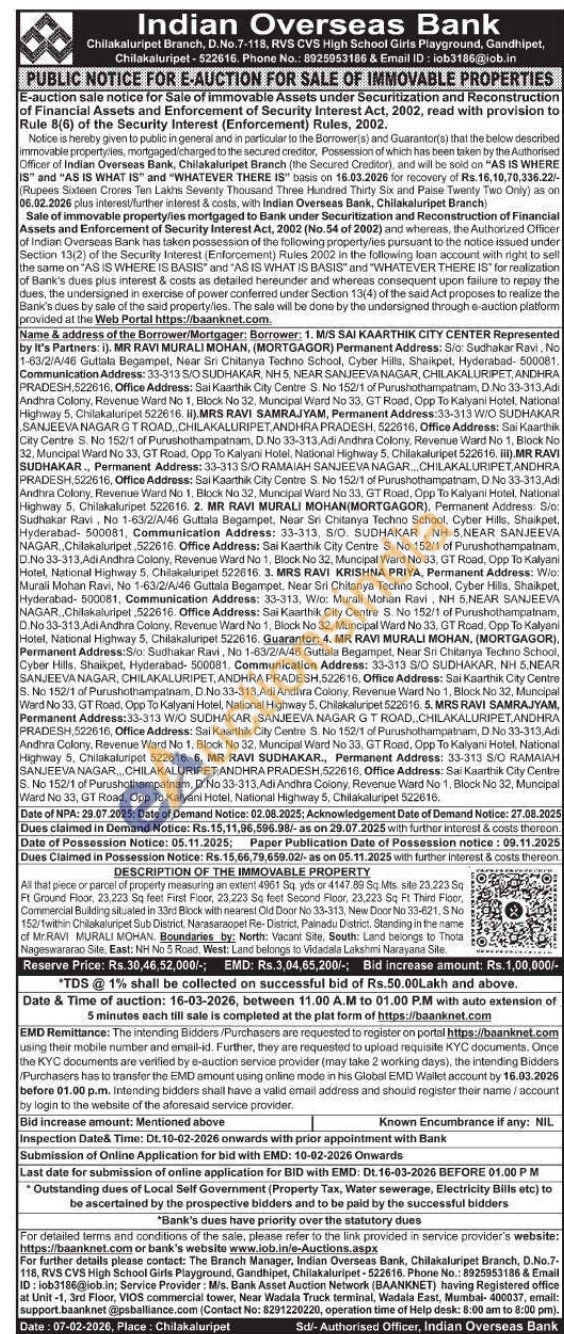 All that piece or parcel of property measuring an extent 4961 Sq yds or 4147.89 Sq. Mts. site 23,223 Sq Ft Ground Floor, 23,223 Sq feet First Floor, 23,223 Sq feet Second Floor, 23,223 Sq Ft Third Floor, Commercial Building situated in 33rd Block with nearest Old Door No 33-313, New Door No 33-621. S No 152/1within Chilakaluripet Sub District. Narasaraopet Re-District, Painadu District. Standing in the name。 of Mr.RAVI MURALI MOHAN. Boundaries by: North: Vacant Site, South: Land belongs to Thota Nageswararao Site, East: NH No 5 Road, West: Land belongs to Vidadala Lakshmi Narayana Site