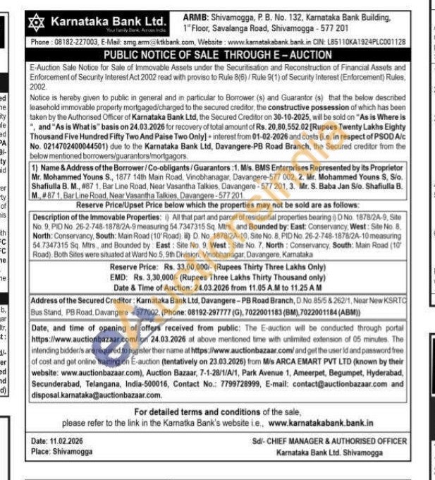 Description of the Immovable Properties: All that part and parcel of residential properties bearing D No. 1878/24-9, Ste No. 9, PID No. 26-2-748-1878/2A-9 measuring 54.7347315 Sq. Mtrs, and Bounded by: East: Conservancy, West: Site No. 8. North: Conservancy, South: Main Road (10'Road). I D No. 1878/24-10, Site No. 8. PID No. 26-2-748-1878/2A-10 measuring 54.7347315 Sq. Mtrs, and Bounded by East: Site No. 9, West: Site No. 7, North Conservancy, South: Main Road (10 Road) Both Sites were situated at Ward No.5, 9th Division, Vinobhanagar, Davangere, Karnataka