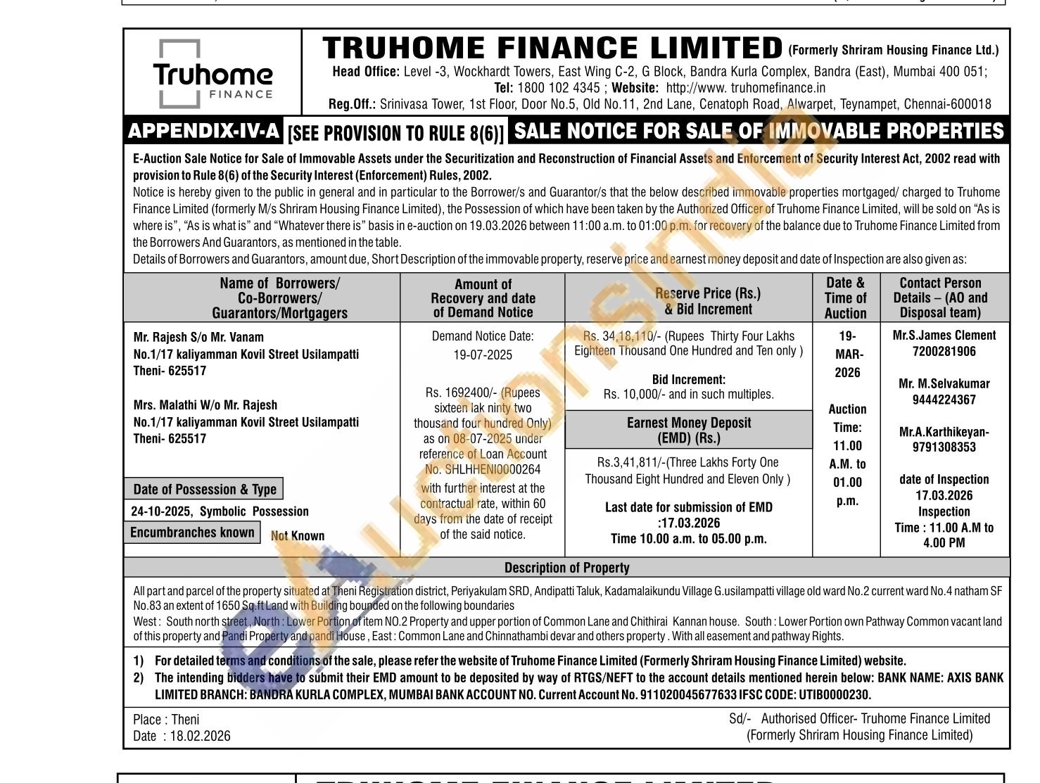 All part and parcel of the property situated at Theni Registration district, Periyakulam SRD, Andipatti Taluk, Kadamalaikundu Village G.usilampatti village old ward No.2 current ward No.4 natham SF No.83 an extent of 1650 Sq.ft Land with Building bounded on the following boundaries West: South north street, North: Lower Portion of item NO.2 Property and upper portion of Common Lane and Chithirai Kannan house. South: Lower Portion own Pathway Common vacant land of this property and Pandi Property and pandi House, East: Common Lane and Chinnathambi devar and others property. With all easement and pathway Rights.