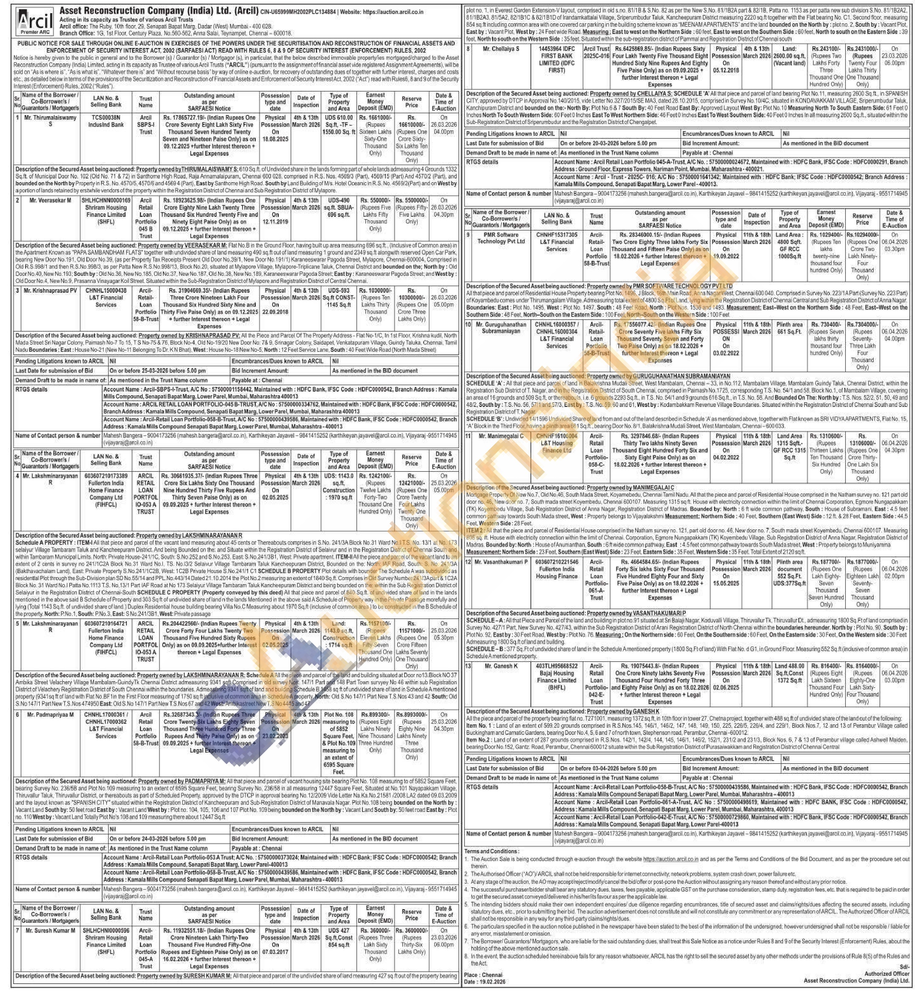 Description of the Secured Asset being auctioned: Property owned by MANIMEGALAI C Mortgage Property Of New No.7. Old No.46, South Mada Street, Koyamebedu, Chennai Tamil Nadu. All that the piece and parcel of Residential House comprised in the Natham survey no. 121 part old door no. 46, New door no. 7, South mada street Koyembedu, Chennai 600107, Measuring 1315 sq ft. House with electricity connection within the limit of Chennai Corporation, Egmore Nungapakkam (TK) Koyembedu Vilage, Sub Registration District of Anna Nagar, Registration District of Madras. Bounded by: North: 6 ft wide common pathway, South: House of Subramani. East: 4.5 feet common pathway towards South Mada street, West: Property belongs to Vijayalakshmi Measurement: Northern Side: 40 Feet, Southern (East West) Side: 12 ft. & 28 Feel, Eastern Side: 44.5 Feat, Western Side: 28 Feet. ITEM 2: All that the piece and parcel of Residential House comprised in the Natham survey no. 121, part old door no. 46, New door no. 7. South mada street Koyembedu. Chennai 600107. Measuring 805 sq. ft. House with electricity connection within the limit of Chennal. Corporation, Egmore Nungapakkam (TK) Koyembedu Village, Sub Registration District of Anna Nagar, Registration District of Madras, Bounded by: North: House of Anumanthan, South: 6ft wide common pathway, East: 4.5 feet common pathway towards South Mada street, West: Property belongs to Muniyamma Measurement: Northern Side: 23 Feet, Southern (East West) Side: 23 Feet Eastern Side: 35 Feel. Western Side: 35 Feel Total Extent of 2120 sqft