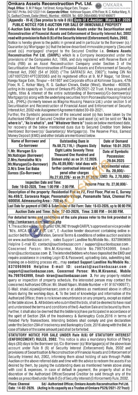 Description of the property: Residential Flat no F2, First Floor, Plot no C, Survey No.498/2, Saravana Nagar, Poonamalle Village, Poonamalle Taluk, Chennai Pin 600056. Admeasuring Area:- 700 sq. ft
