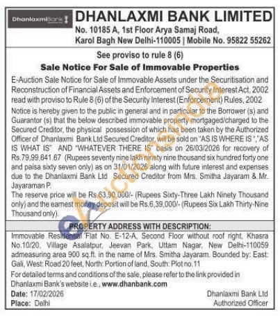 Immovable Residential Flat No. E-12-A, Second Floor without roof right, Khasra No.10/20, Village Asalatpur, Jeevan Park, Uttam Nagar, New Delhi-110059 admeasuring area 900 sq.ft. in the name of Mrs. Smitha Jayaram. Bounded by. East: Gali, West: Road 20 feet, North: Portion of land, South: Plot no. 11
