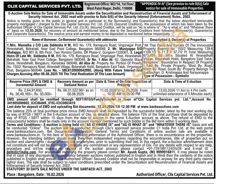All That Piece And Parcels Of The Immovable Property Bearing No. 155/2 Measuring 139.6 +109.7/2 X 71.3 + 37.7/2 Ft Total Measuring 673.425 Sq. Mtrs Situated At Hiranadhali Village, Bidarahalli Hobli, Bangalore East Taluk, Bangalore", Boundaries In Respect Of Property East By: Private Property, West By: Road, North By: Road, South By: Property Belongs To Subbachari, D. Krishnappa And Narayanappa Type of Possession - Symbolic