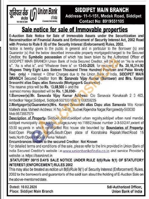 Description of Property- Siddipet district,siddipet urban registry, siddipet urban rural mandal, siddipet municipality area, siddipet village, survey no. 1188/2, house number 2-3-53/2/41,extent of 53.50 sq.yards in which constructed Rcc house site bounded by: Boundaries of Property-East:Open Place of Ramulu, South: Open place of Kooraboina Rajaiah, West Road 15 feets, North: Open Place of Perka Yellaiah