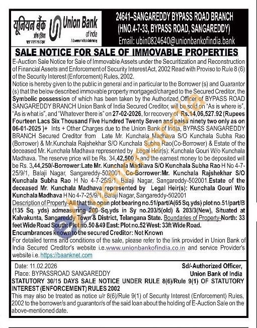 Description of Property-All that the open plot bearing no.51/part/A(65 Sq.yds) plot no.51/part/B (135 Sq. yds) admeasuring 200 Sq.yds in Sy no.203/5(old) & 203/3(New), Situated at Kalvakunta, Sangareddy Town & District, Telangana State. Boundaries of Property-North: 33 feet Wide Road South: Plot no.50 &49 East: Plot no.52 West: 33ft Wide Road