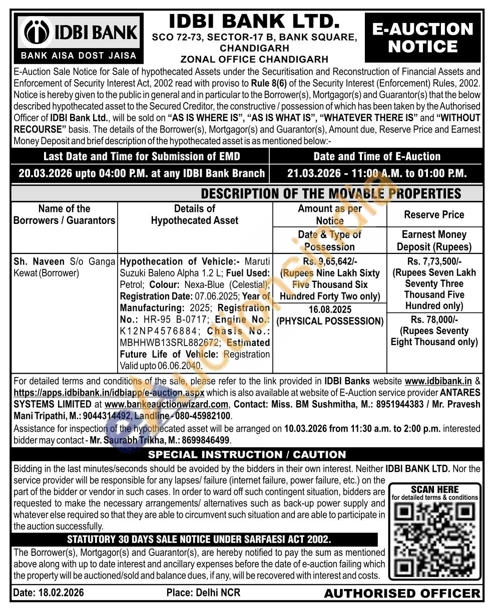 Hypothecation of Vehicle:- Maruti Suzuki Baleno Alpha 1.2 L; Fuel Used: Petrol; Colour: Nexa-Blue (Celestial); Registration Date: 07.06.2025; Year of Manufacturing: 2025; Registration No.: HR-95 B-0717; Engine No.: K12NP4576884; Chasis No.: MBHHWB13SRL882672; Estimated Future Life of Vehicle: Registration Valid upto 06.06.2040.