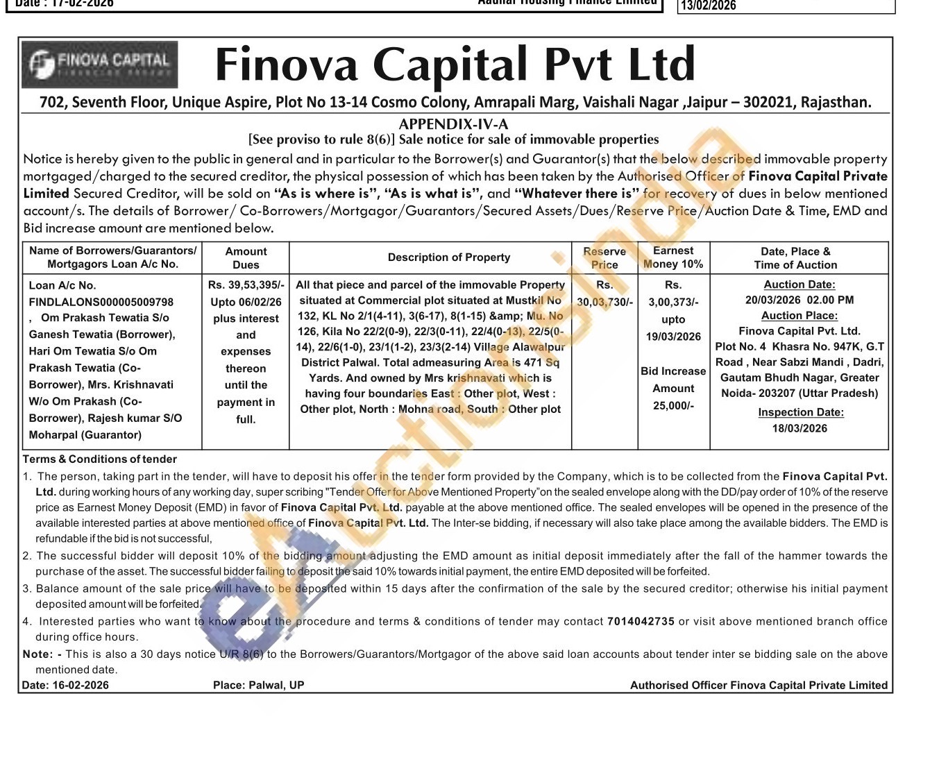 All that piece and parcel of the immovable Property situated at Commercial plot situated at Mustkil No 132, KL No 2/1(4-11), 3(6-17), 8(1-15) & Mu. No 126, Kila No 22/2(0-9), 22/3(0-11), 22/4(0-13), 22/5(0-14), 22/6(1-0), 23/1(1-2), 23/3(2-14) Village Alawalpur District Palwal. Total admeasuring Area is 471 Sq Yards. And owned by Mrs krishnavati which is having four boundaries East: Other plot, West: Other plot, North: Mohna road, South: Other plot